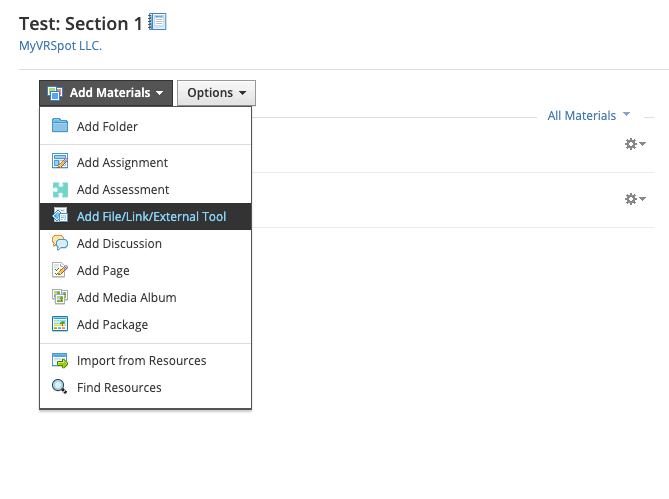- Click on the Add Materials drop down menu and select Add File/Link/External Tool.