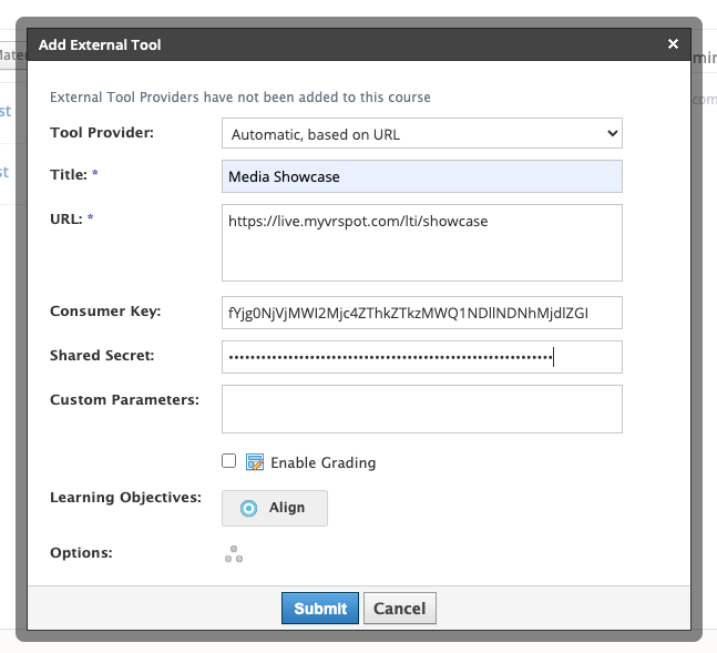 - Keep the Tool Provider as Automatic, based on URL. Fill out the rest of the form with your Showcase LTI Information. This information is located on your showcase’s options page. Note that the URL on the form is referring to the LTI Launch URL.