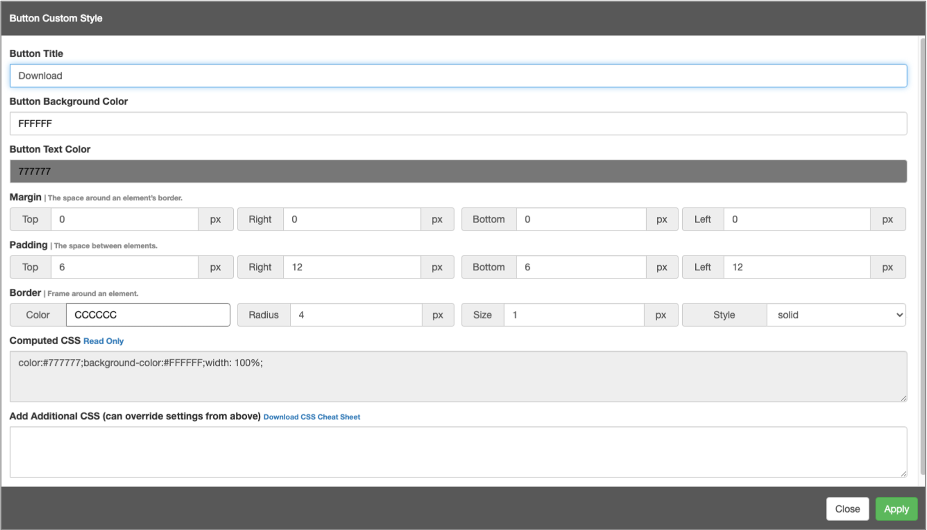 - The file will now appear as a downloadable document. You can have this download button appear with any text and color you like. Edit the text, colors, and CSS by clicking the edit icon (gold gear). For example, you may want to change the text to “Click here to download today’s assignment,” change the button color to blue, and change the text color to black.