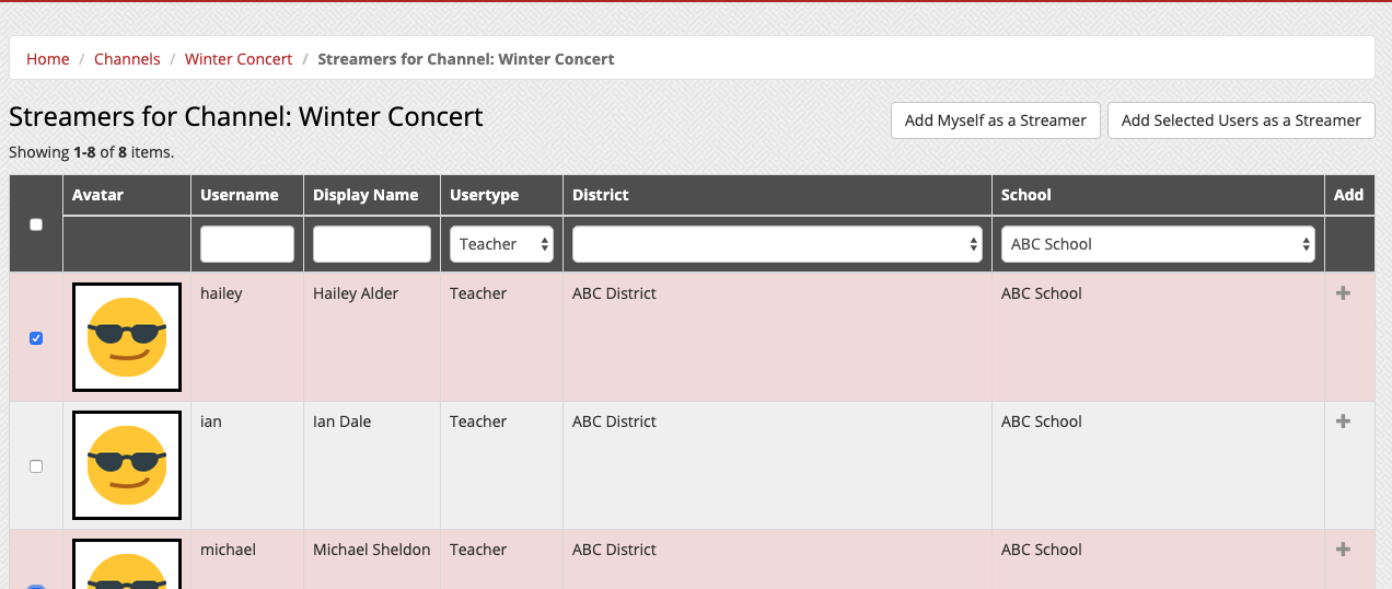 Step 2: From the list of users in your district, check the checkbox to the left of the users’ names that you would like to stream. Then click the Add Selected Users as a Streamer button.