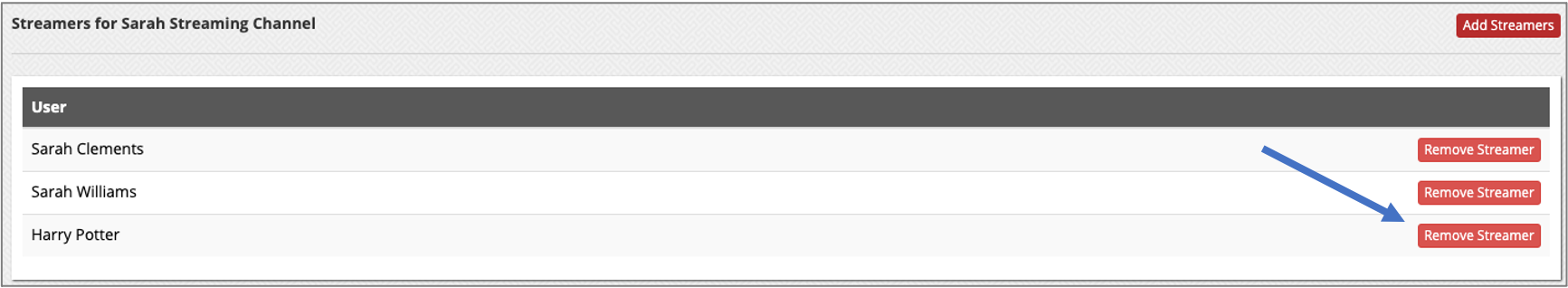 If you need to remove a streamer from a channel, click the Streaming dropdown and select My Streaming Channels. Click the View icon (eye) to the right of the channel you want to update, and then scroll down to the end of this page and click the Remove Streamer button to the right of the user’s name.