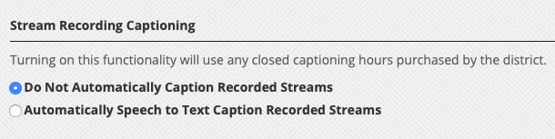 Users with administrative roles can toggle on and off the functionality to automatically add closed captioning to your live stream recordings.