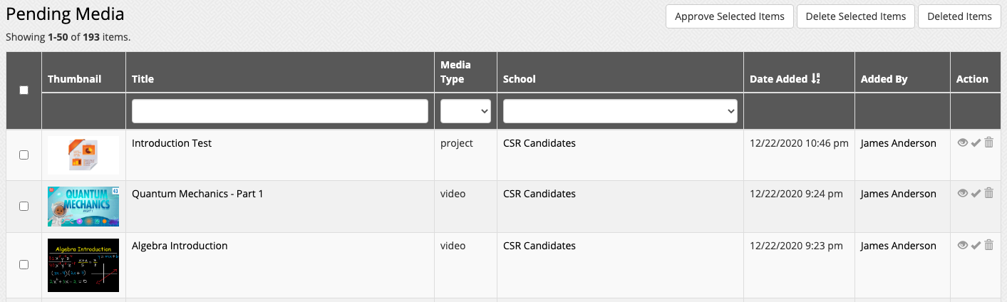Once the media has been reviewed, and the teacher or admin feels it is appropriate for all other users in the school or district to view, they click the check mark in the Action column to the far right of the file. To approve multiple files at a time, click inside the checkbox to the left of each file, and then click the Approve Selected Items button at the top right of the screen.