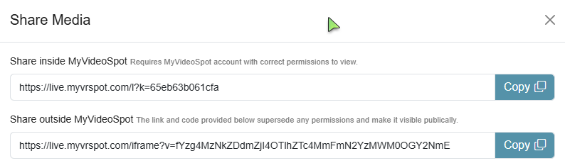 - Internal Link – Requires users to be logged into a MyVideoSpot account