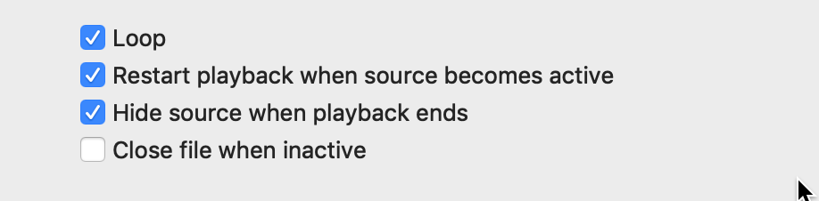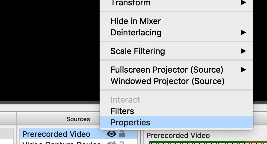 To change your pre-recorded video’s settings, right-click on the video and click Properties. Now, checkmark Loop, Restart playback, and Hide source, and press OK.